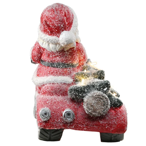 Snow sprinkled Santa is seated on a bright red motorbike carrying an evergreen tree