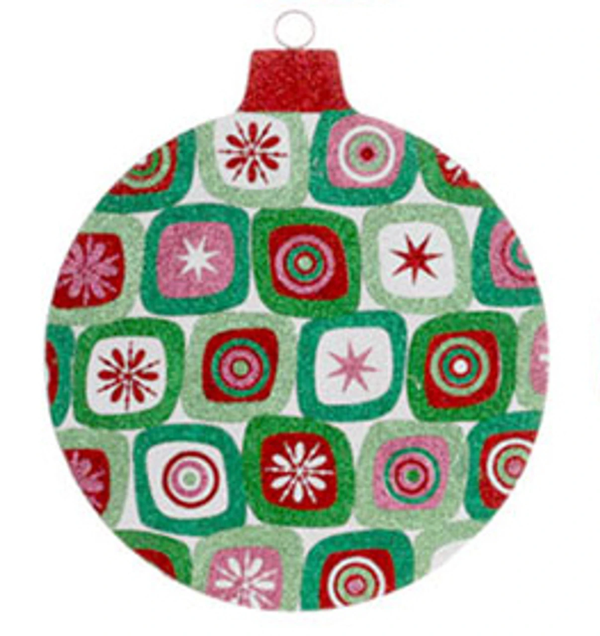 This flat glitter drenched ball ornament features a unique red, green and pink glitter star and circle swirl design