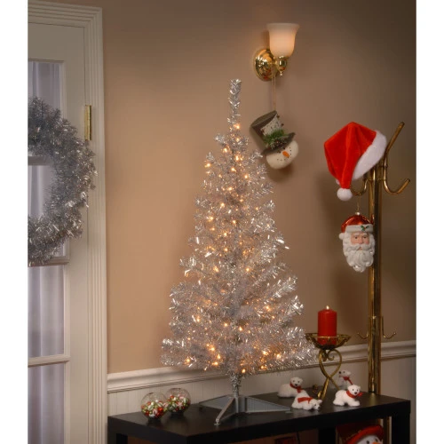 - Prelit Shiny Silver Tinsel Artificial Christmas Tree