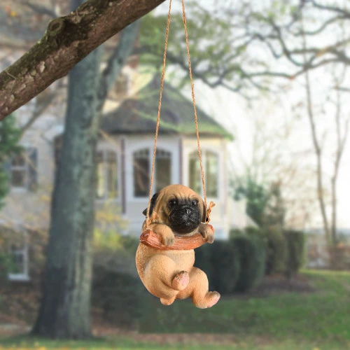Black and brown pug puppy swinging in a tree