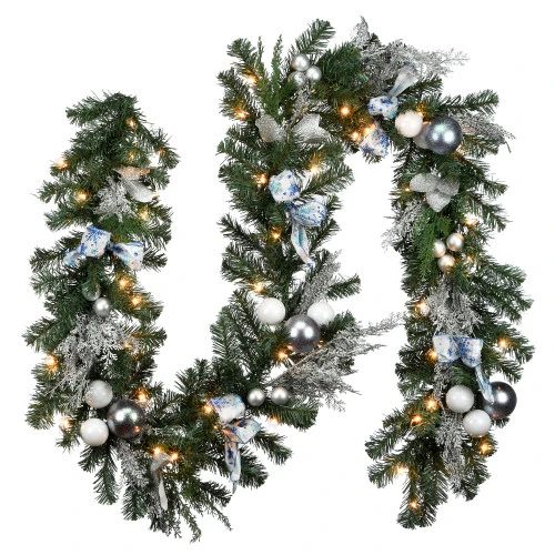 - Trimmed with silver leaves, sprigs, ball ornaments and ribbon