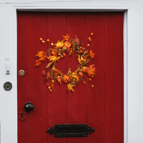 - Trimmed with pumpkins, gourds, pinecones and berries