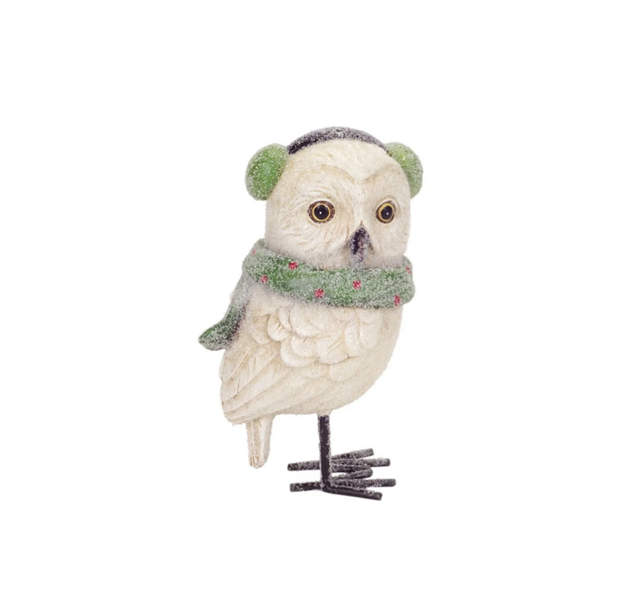 This figurine accented with a green scarf with red polka dots and matching green ear muffs