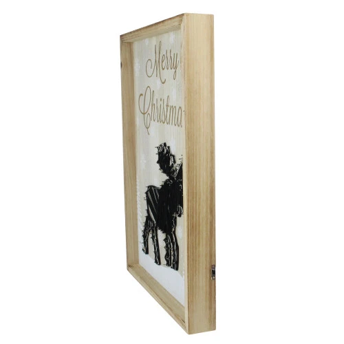 - There is a black moose formed with mini nails and black yarn in the middle with trees snow and snowflakes