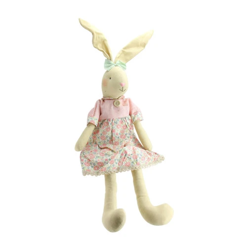 Features a tan linen bunny rabbit, wearing a pink cotton floral dress with a wooden button