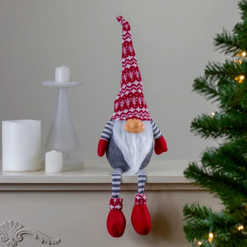 Features a gray body with striped sleeves, red mittens, and a Christmas themed hat
