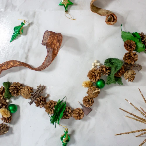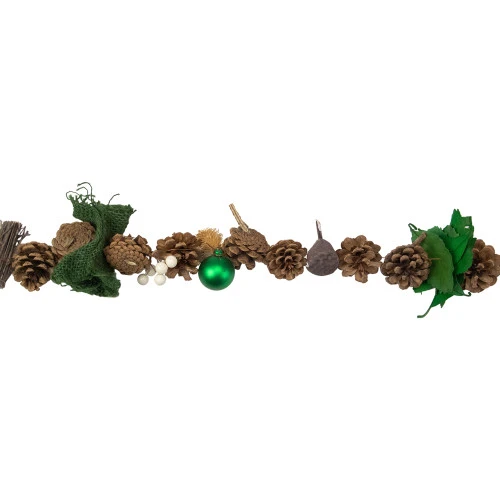 Add a special touch to your holiday decor with this rustic pine cone and burlap garland. This beautiful garland features green ball ornaments, green leaves, seedpods, twigs, and berries. This garland is the perfect touch of holiday cheer for around mantle places, doorways, or around your Christmas tree.